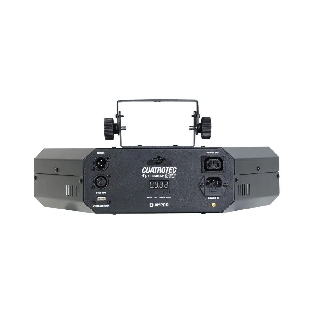 El Tecshow Lighting Cuatrotec EVO es un efecto LED de 4 vías tipo moonflower equipado con 152 LEDs RGBW. El equipo entrega 4 haces de 15º potentes y definidos a través de sus 4 lentes. Incorpora función de estrobo, programas integrados, y 4 modos de operación: DMX, audiorítmico, auto, y control remoto. Cuatrotec EVO es la evolución del exitoso CuatroTec I & II en una versión más potente.