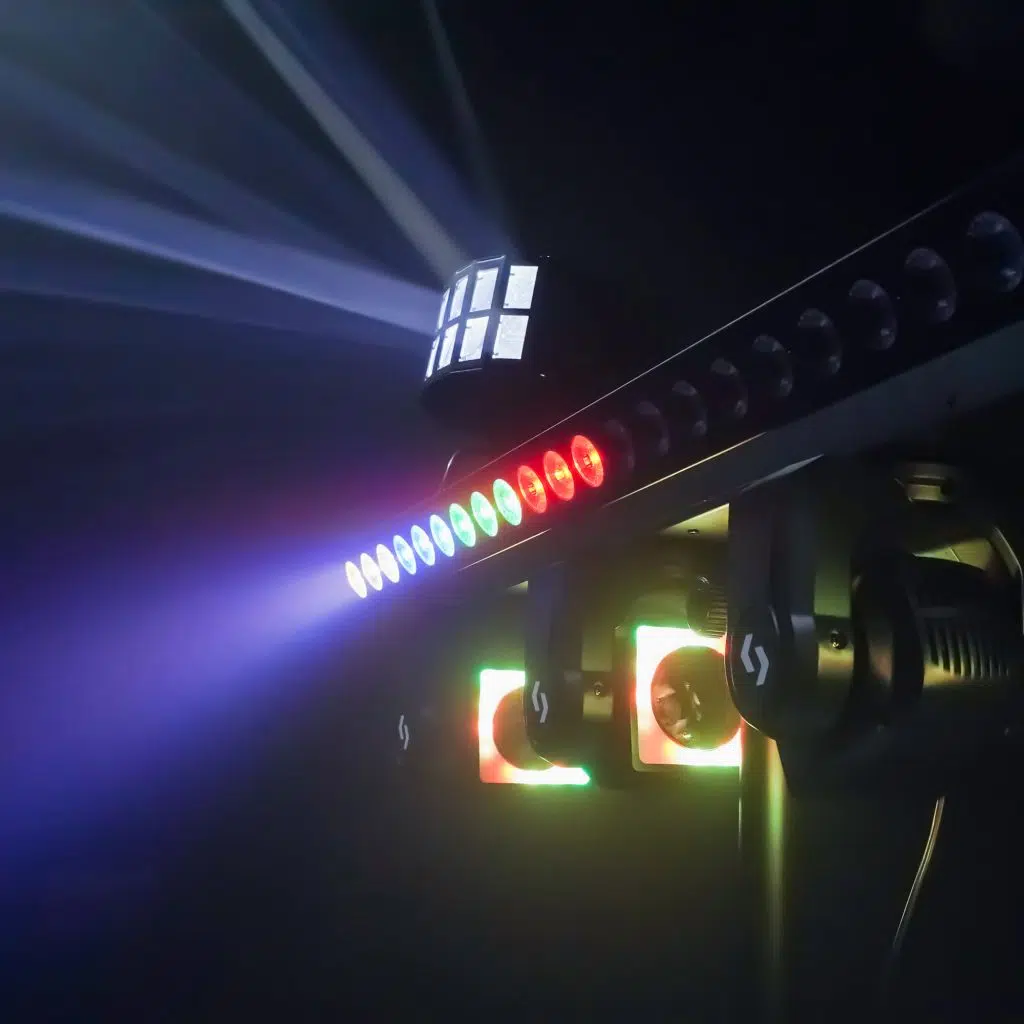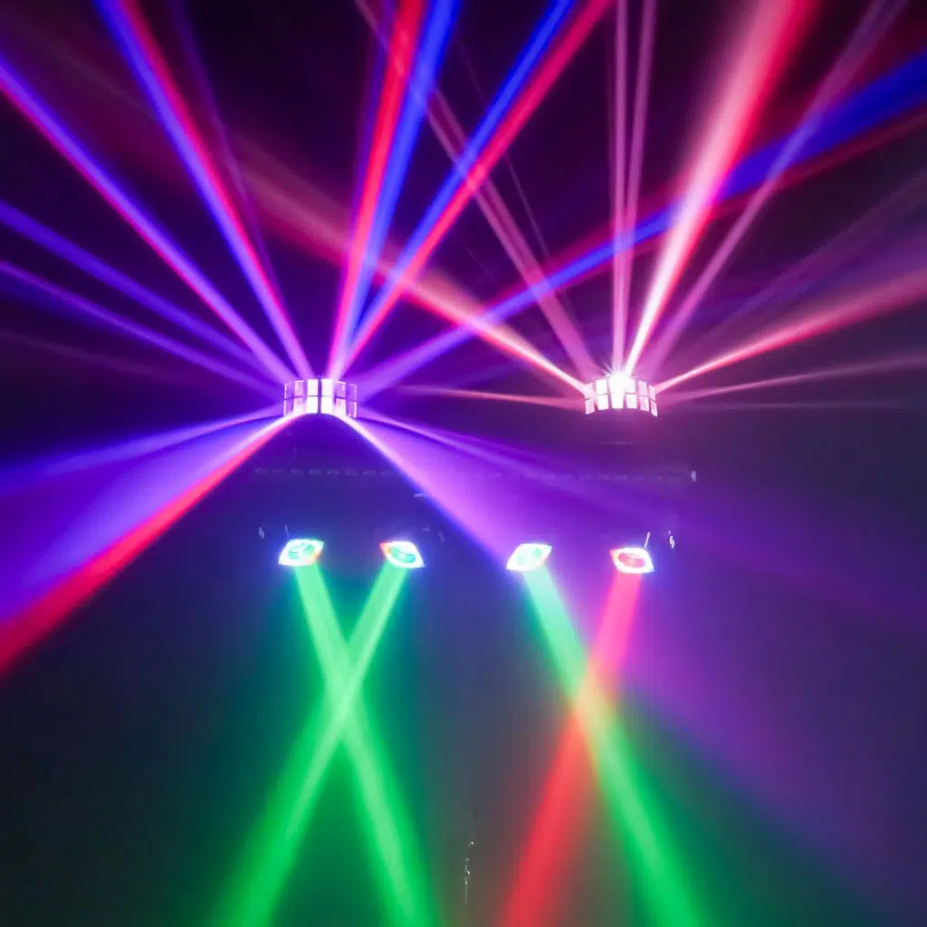 Fuente de luz: 4×40W Cabezal móvil + 2×2×10W DERBY RGBW + 24×2W WASH Sección cabezales móviles: 4 x Beam RGBW de 40W + 4 módulos RGB de 24 LEDs de 0.2W cada uno en cara frontal para efectos visuales Sección barra wash: 24 LEDs RGBW de 2W Estrobo: 1–20Hz